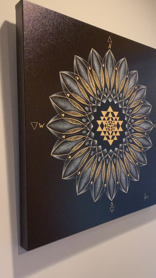 The Golden Sri Yantra: At the mandala's heart beats the ancient Sri Yantra, the ultimate geometry of manifestation and protection. This sacred symbol, rendered in luminous gold, serves as the cosmic center where all possibilities converge and from which all creation emerges. It represents the divine feminine principle, the great Mother from whose cosmic womb all life springs forth.